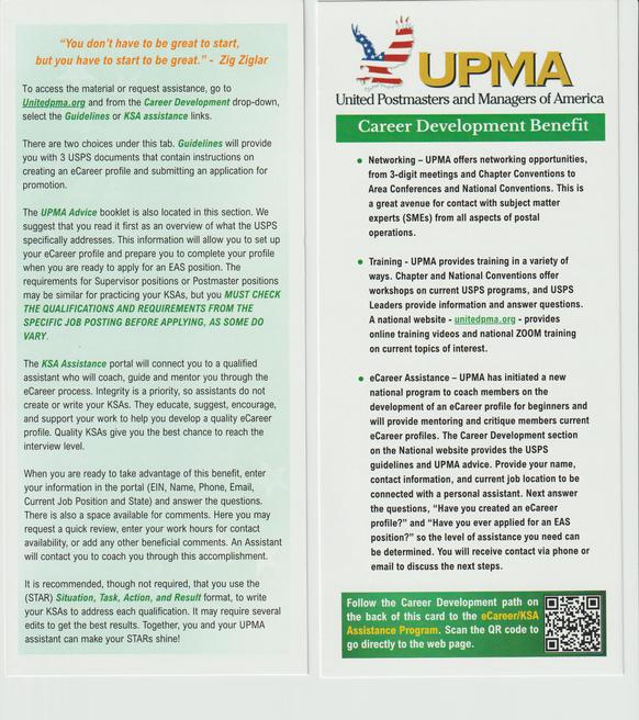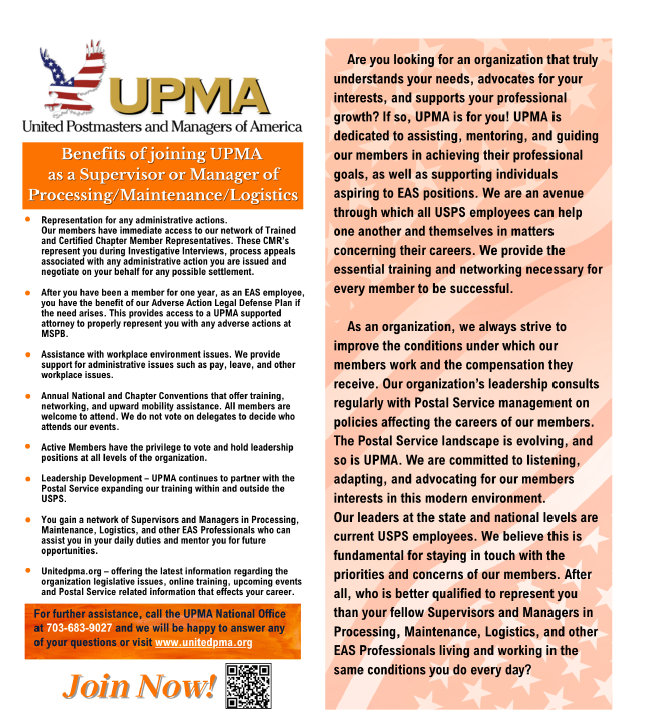 The purpose of UPMA is to assist, mentor and guide all Postmasters, Managers and Supervisors -- as well as anyone aspiring to these positions -- toward achieving their professional goals. We are an avenue through which all United States Postal Service employees can help one another and themselves in matters concerning their careers. We provide the essential training and networking necessary for every member to be successful.
